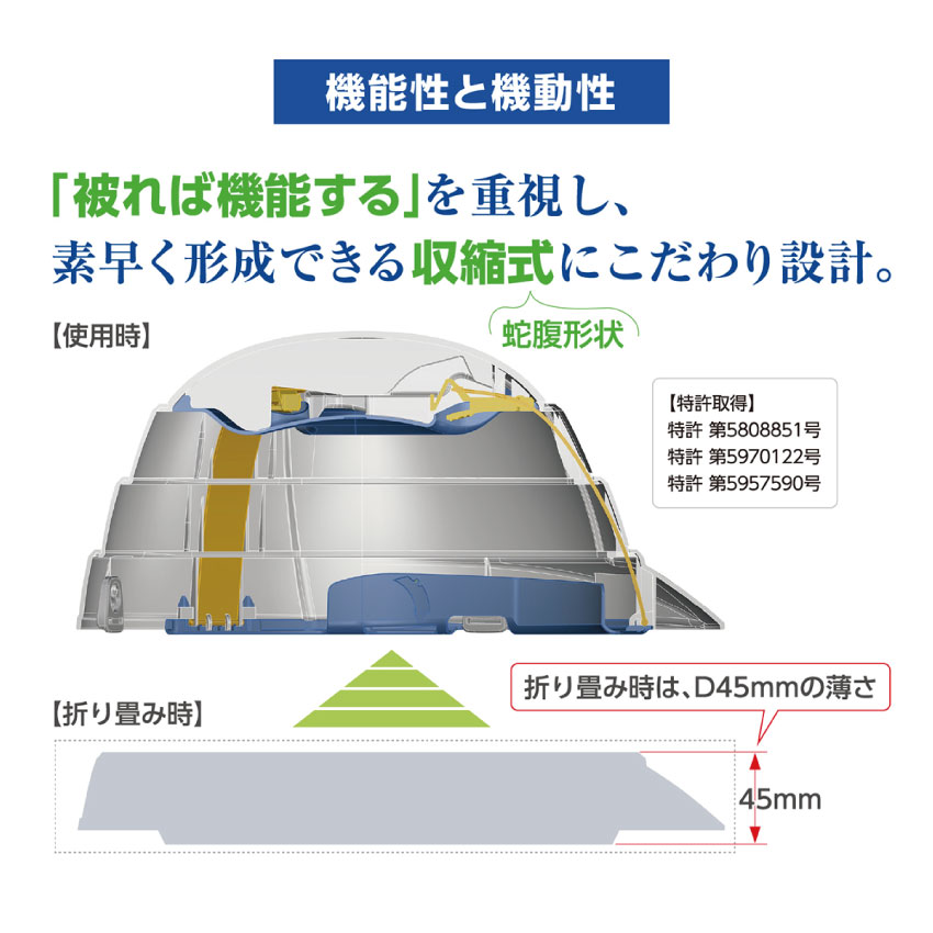 かさばらずに収納しやすい折りたたみヘルメットを、1人1つ備えませんか。